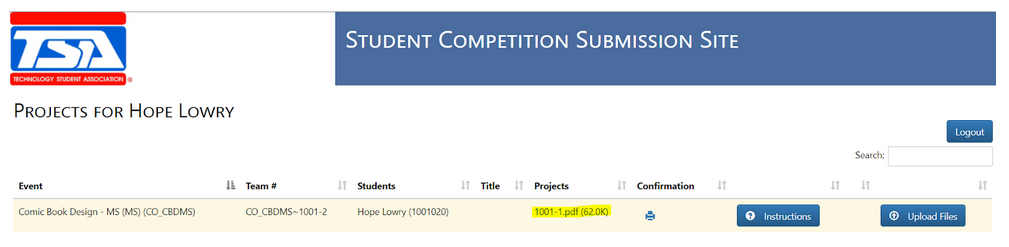 Team Events: File must be named TeamID.pdf (e.g. 1001-1.pdf)After logging in, you will see your events listed
